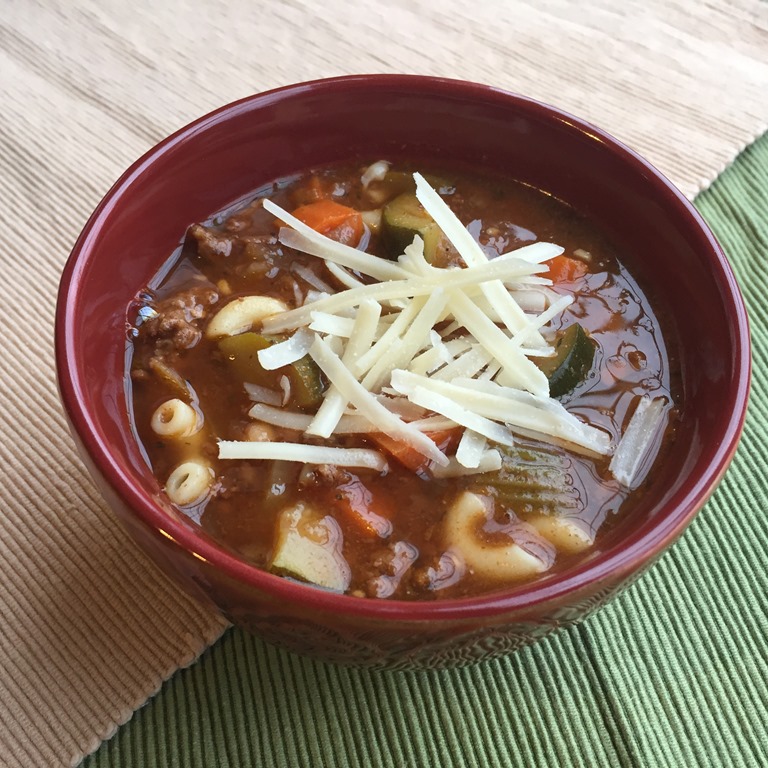 Chock-full of tender ground beef, vegetables, beans, and pasta, this soup is very filling and is especially good topped with freshly grated Parmesan cheese.