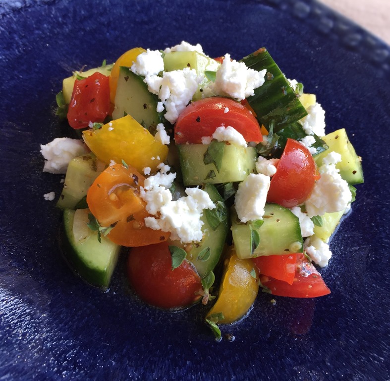 Combine chopped tomatoes, cucumbers, red pepper, and onion. Stir together dressing ingredients. Pour over salad. Stir in feta just before serving (or serve feta on the side).