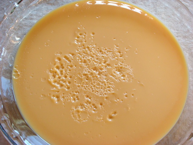 This is the first “recipe” for dulce de leche that I’ve made with actual ingredients. This is adapted from a recipe from Alton Brown. It is a lot more time consuming than any of the other methods, but is it ever worth it! This was truly decadent! Don’t you just love the vanilla bean flecks? As the other methods produced a caramel that was more of a dipping or spreading consistency, I wanted this one to be one that I could pour.